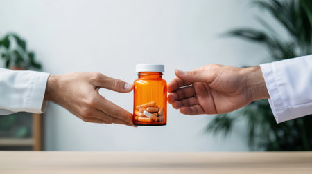 Hands of adult caucasian males exchanging prescription pill bottle indoors.