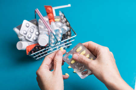 female hands with pills on the background consumer basket products with medicines