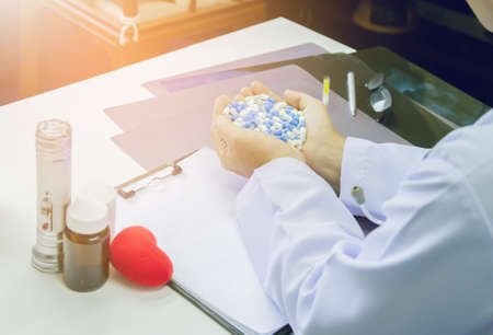 Healthcare and medical concept . Doctor in uniform holding white and blue capsule pill in office at hospital,Selective focus
