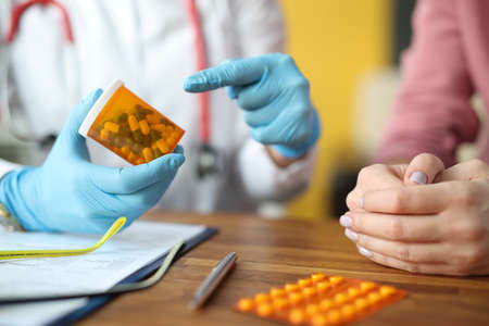 Doctors hand points to pills next to patient sitting. Prescribing medicines to patients concept