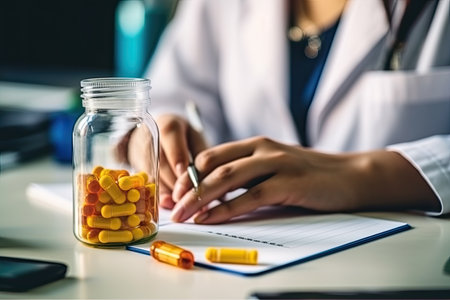 doctor's hands in a white medical coat write a prescription, two white pill bottles and a blue stethoscope on a blue background. concept of medicine