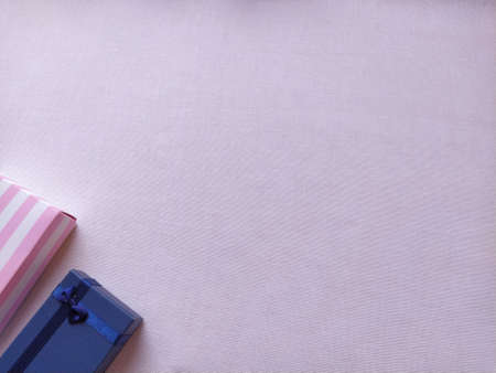 Pink and blue gift boxes with a bow on a pink fabric background. Copy space. Gifts for the holiday. Gift decoration. Woolen cloth or burlap.