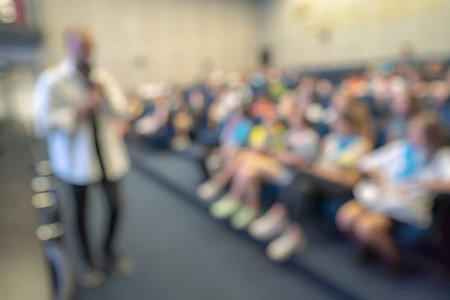 Abstract blurred people lecture in seminar room, education concept. High quality photo