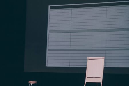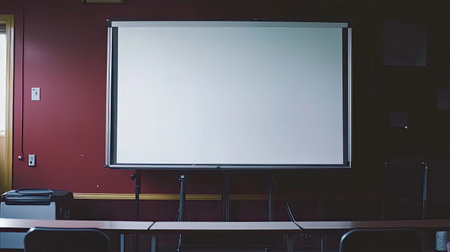 A blank screen in an empty classroom provides a minimalist and professional atmosphere, perfect for presentations, training, or workshops in an educational setting.