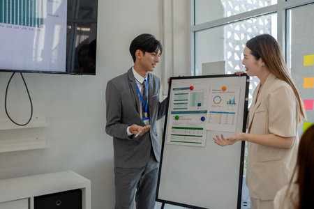 Group of business people meeting in conference room. Asian businessman speech, present teamwork partnership. Happy business people meeting present graph chart investment, business data in meeting room