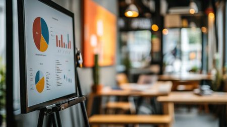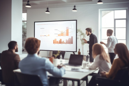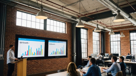 A business presentation is in progress within a contemporary office space. The scene features a speaker, seated audience, and large display screens showcasing data charts. The interior reveals brick walls, large windows, and overhead lighting creating a dynamic ambiance. Suitable for visual concepts related to business and presentations.