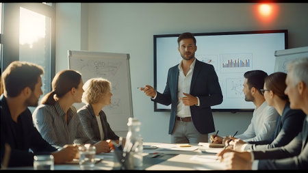 Professional business man standing at meeting room while presenting financial statistic to diverse investors. Smart project manager talking about start up plan while analyzing marketing chart. AIG42.