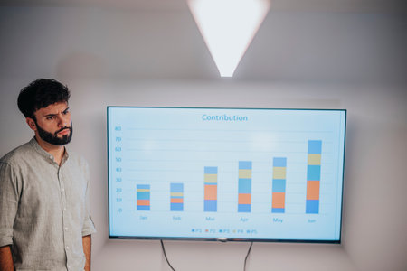 A handsome caucasian man entrepreneur showing growth charts of his company on a plasma screen during a business meeting in a board room of a modern office, his female colleague sitting at the table
