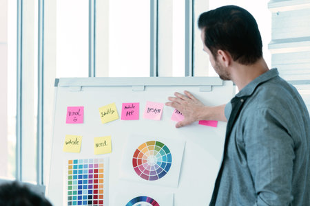 Professional young leader present business idea by using mind map at business meeting surrounded by professional cooperate colleague discussing and brainstorming about her strategy. Immaculate.