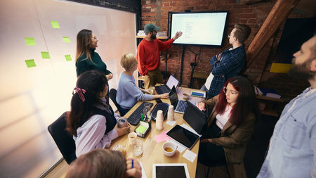 Young Black man presenting real estate marketing strategy to diverse group of young adults in modern office, colleagues listening and taking notes while viewing digital presentation on screen