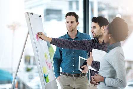 Excellence follows a good plan. Cropped shot of colleagues having a discussion using a whiteboard in an office.