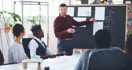 Man, people and document for presentation in office of creative startup, planning and venture pitch. Speaker, team or briefing with chalkboard, business ideas and brainstorming for marketing strategy