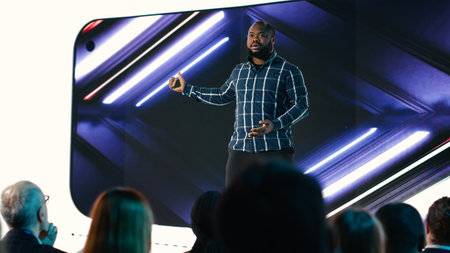 Black senior designer introduces new smartphone to participants during business summit panel discussion. Electronics product presentation with reveal of new mobile device.