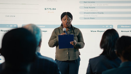 African american woman makes a speech at international summit in conference hall, presentation with reports and investments for networking. Speaker engages audience in business forum.