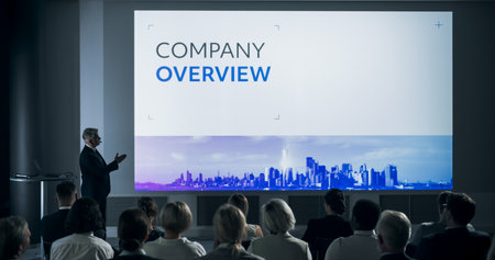 Corporate Event: Caucasian Male Top Manager Giving Presentation To Colleagues or Investors In Conference Room Of Innovative Startup Office. Man Talking About Data Analysis,