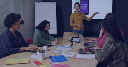 Presenting red-sweater leader addressing team at conference room with display showing smartphone. Boardroom, collaboration, corporate, briefing, laptops, notes, coffee
