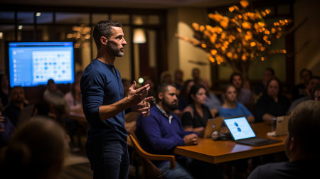 Group of people attending a business presentation, focusing on the speaker at the front of the room. Professional setting for corporate or educational event.