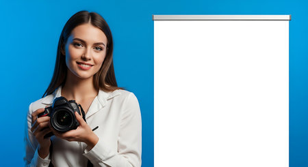 Portrait of a beautiful young woman holding a camera and a whiteboard on a blue background