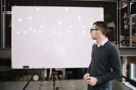 Male lecturer with marker looking at a whiteboard