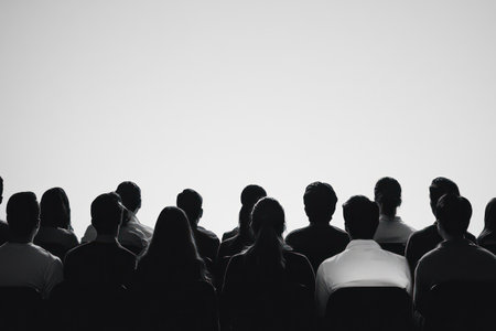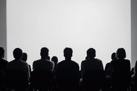 Wide view of seated silhouettes watching a presentation, symbolizing learning, collaboration, and professional or educational events.