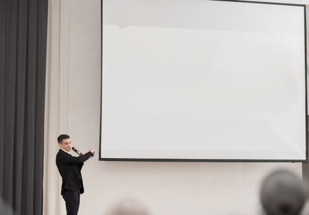 speaker conducts the business of the conference standing in front of a large white screen on the stage in the conference room