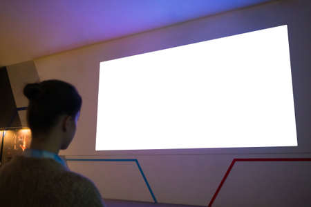 Woman looking at large wall blank interactive white display in dark room of modern technology exhibition, museum or cinema. Mock up, white screen, futuristic, template, education, isolated concept