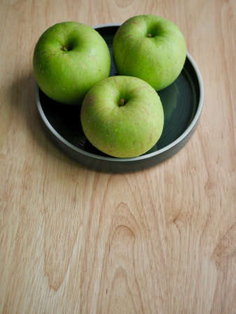 green apple on wood plate