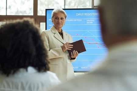 Caucasian hospital executive presenting medical statistics on large screen to group of healthcare professionals, holding notebook and addressing audience during conference meeting