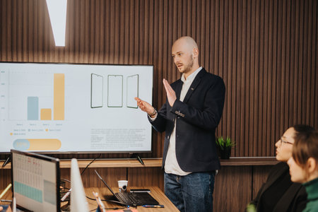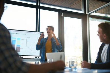Business professional presenting data insights to colleagues in a modern meeting room