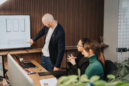 Manager leading a brainstorming meeting with a group of creative designers in the office. Leader and business concept
