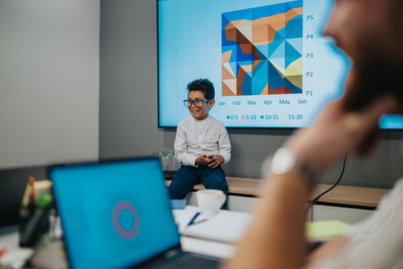 Young boy presenting in a modern office with colorful geometric chart on screen