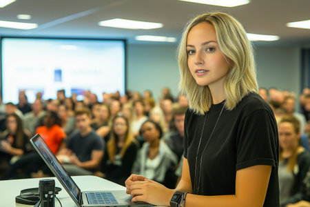 young businesswoman at business conference room with public giving presentations. Audience at the conference hall. Entrepreneurship club