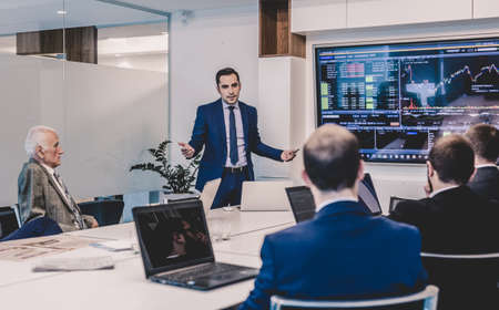 Professional business man standing at meeting room while presenting financial statistic to diverse investors. Smart project manager talking about start up plan while analyzing marketing chart. AIG42.