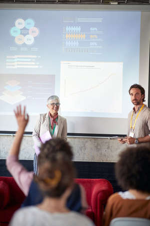Audience is asking a questions at a presentation in a pleasant atmosphere in the conference room. Employees, office, work
