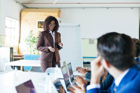 Business presentation by young business lady from africa, share experience with young leaders
