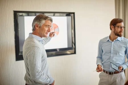 If I could direct your attention to the screen.... Shot of two businessmen giving a presentation to at work.