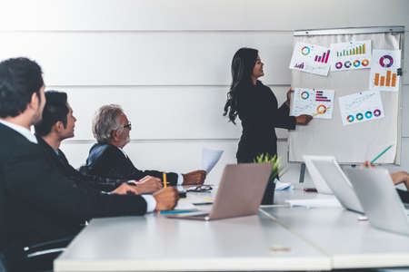 Asian business people listening to presentation from the businesswoman who stands in front of the group meeting room at the international business conference. Multicultural corporate strategy concept.