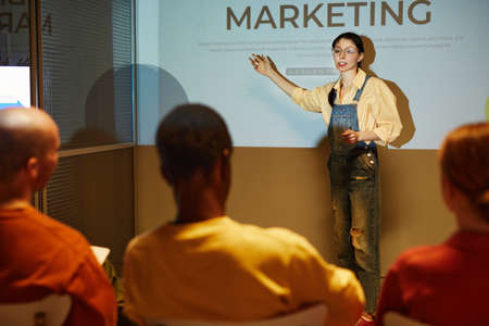 Portrait of female marketing expert giving presentation by projector screen and talking to audience in business training, copy space