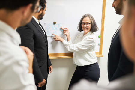 Older businesswoman as a consultant giving a presentation on the whiteboard in the ideas workshop