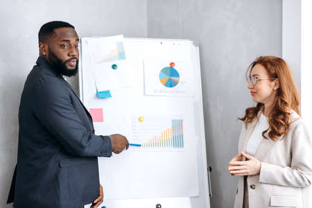 African American man in stylish suit presentation work report on conference with smiling caucasian lady. Influential business partners standing near flipchart with financial graphs, talking about