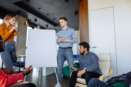 Multiethnic group of young businesspeople preparing for a presentation of their business idea using a flip chart in modern loft meeting room