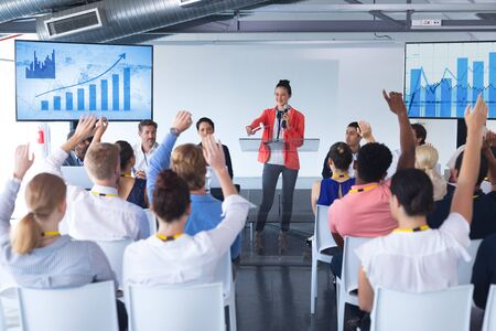 Side view of Mixed-raced businesswoman raising hand in presentation during meeting in a modern office
