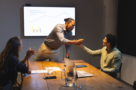 Colleagues celebrating success during a late-night office meeting presentation