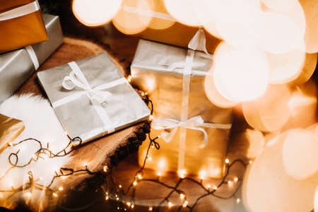 Close up of gifts on floor and Christmas tree. Bokeh garlands in the background. New Year concept.