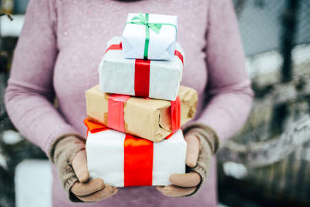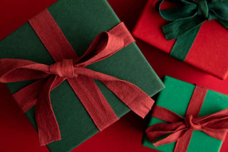 holiday presents delivery. selection of gifts packed in red and craft paper and tied with twine. celebration gratitude and congratulation concept.