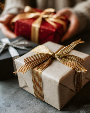 Festive presents with elegant gold ribbon are ideal for birthdays, holidays, and other joyous events