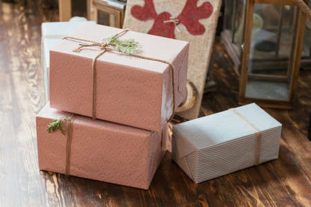 Christmas present boxex on a wooden floor. Preparation for the New Year holidays