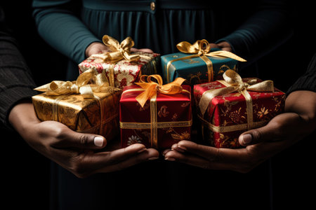 A close-up captures a collection of thoughtfully wrapped gifts, each adorned with gleaming ribbons. A set of hands carefully holds one of the presents, heightening the anticipation of holiday cheer and moments of happiness. The photograph exudes a warm, festive ambiance, suggesting the joy of giving.