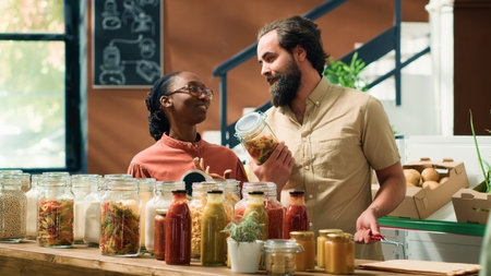 African american vendor showcasing her products in zero waste supermarket, selling organic bio food to interested buyer. Storeowner showing her fresh bulk products merchandise during event.