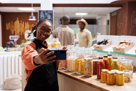 Black-owned eco store promotes sustainable, fresh products in a video call using a smartphone. Homegrown food, glass jars, and zero-waste packaging are highlighted.